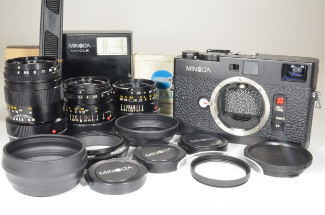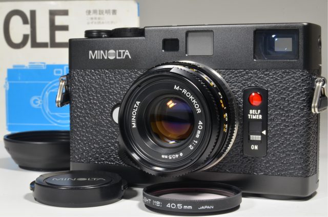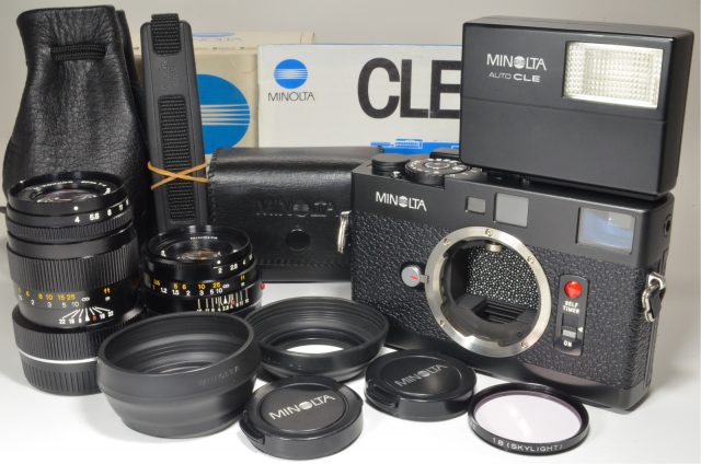 MINOLTA CLE 35mm film camera with M-ROKKOR 40mm f2, 28mm f2.8, 90mm f4 and Flash #a1000