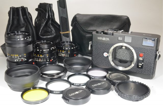 MINOLTA CLE 35mm film camera with M-ROKKOR 40mm f2, 28mm f2.8, 90mm f4 and Case #a1149